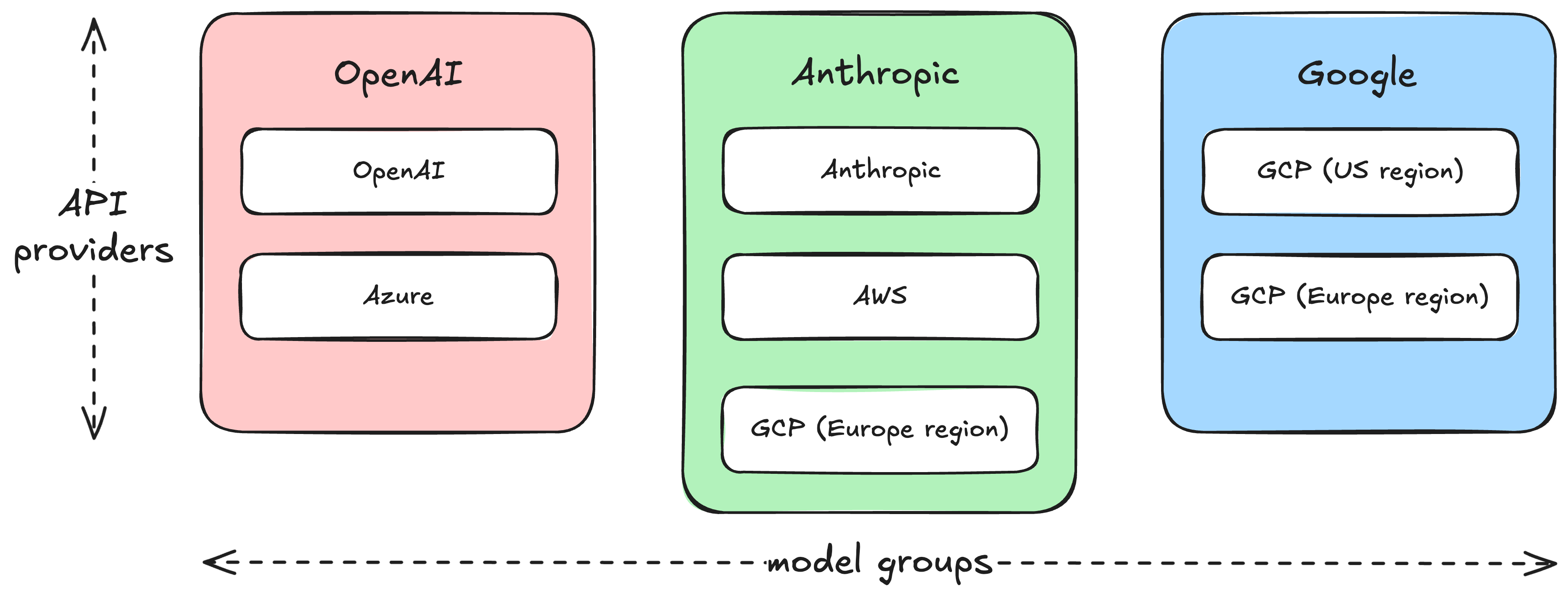 The earliest design choices we made at Gradient Labs favoured an architecture that enables us to experiment with, evaluate, and adopt the best LLMs for each part of our agent. Right now, we use three major groups of models — from OpenAI, Anthropic and Google. Each of these groups of models are hosted in multiple places, giving us the ability to fail over from one place to another: