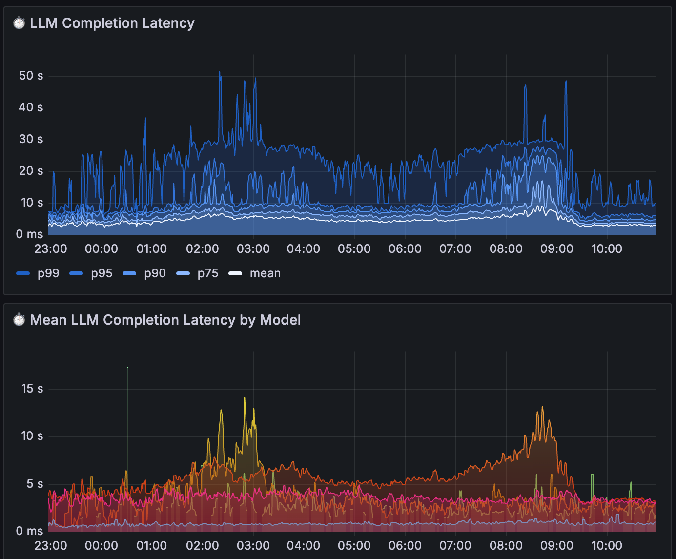 Latency — LLMs can be slow. This is expected to be variable across calls. But we need to look out for scenarios where they’re globally slower than expected—this is a symptom that something is wrong. We currently failover if the request exceeds a timeout in the p99+ percentile of latency.