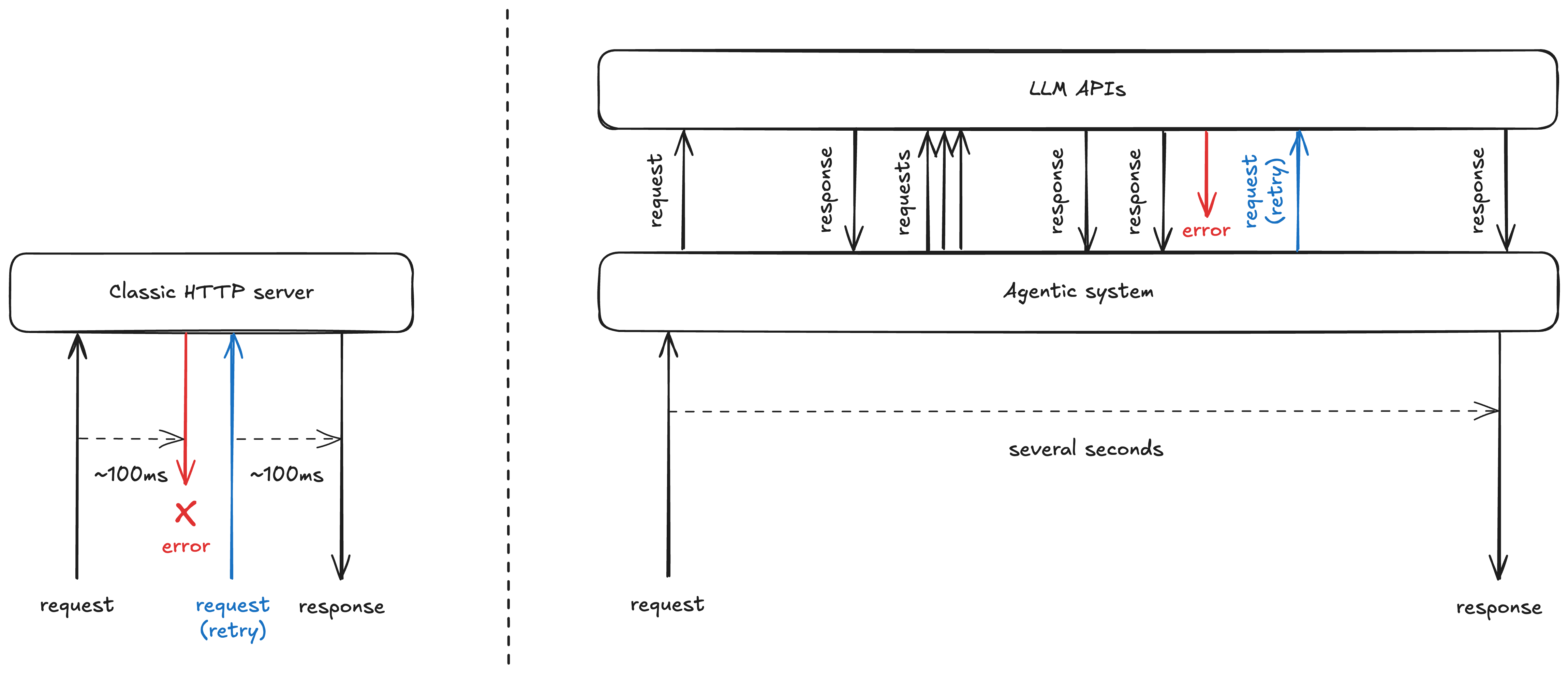In agentic systems, where a single reply may be the result of a chain of LLM calls, requests can span much longer durations. Each LLM call costs both user-facing latency and money, so you don’t want a single failure in that chain to result in the entire request being retried: