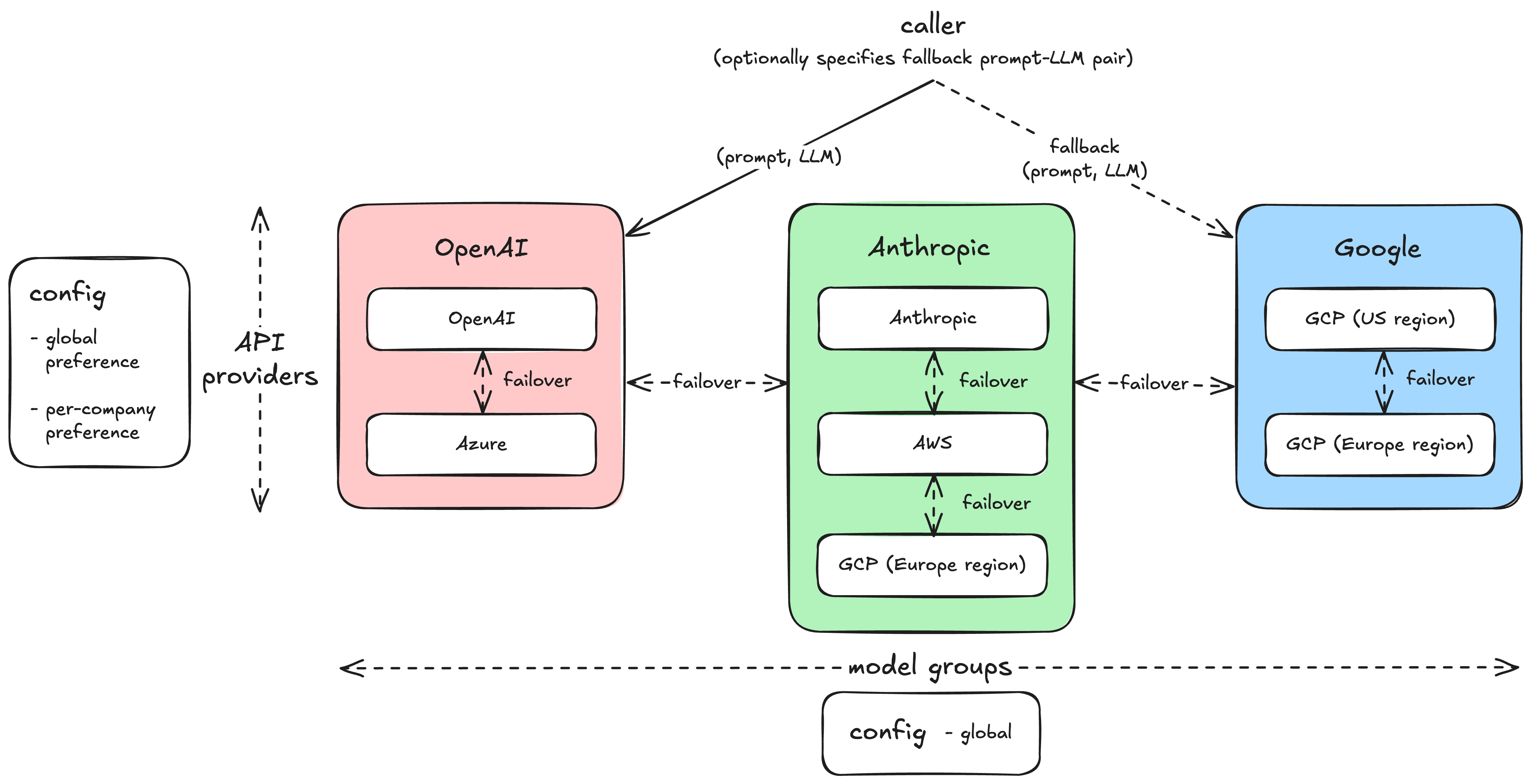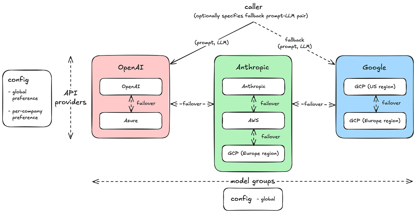 In our platform, each completion request starts with an ordered list of API provider preferences. For example, if we’re making a request for GPT 4.1, we might have the preference ordering: (1) OpenAI, (2) Azure. We can configure these preferences on both a global and a per-company basis, and we can also assign them proportionally to how we want to split traffic across the two. If we encounter certain types of errors, then we failover to the next provider.